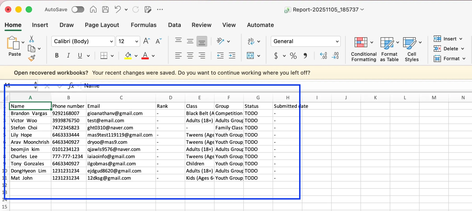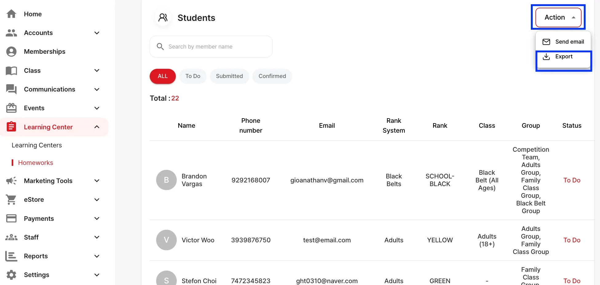 The Excel file will contain: Student name, Contact info, Rank & class details, Homework status, Submission date.