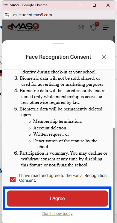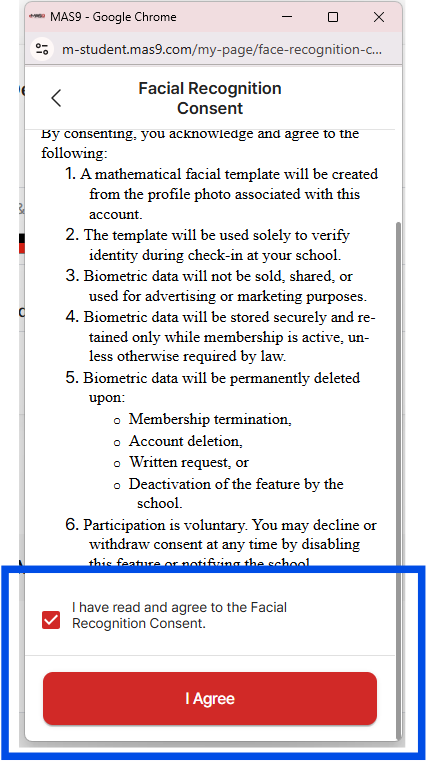 If a student has not agreed at their level, the system will not allow face check-in.