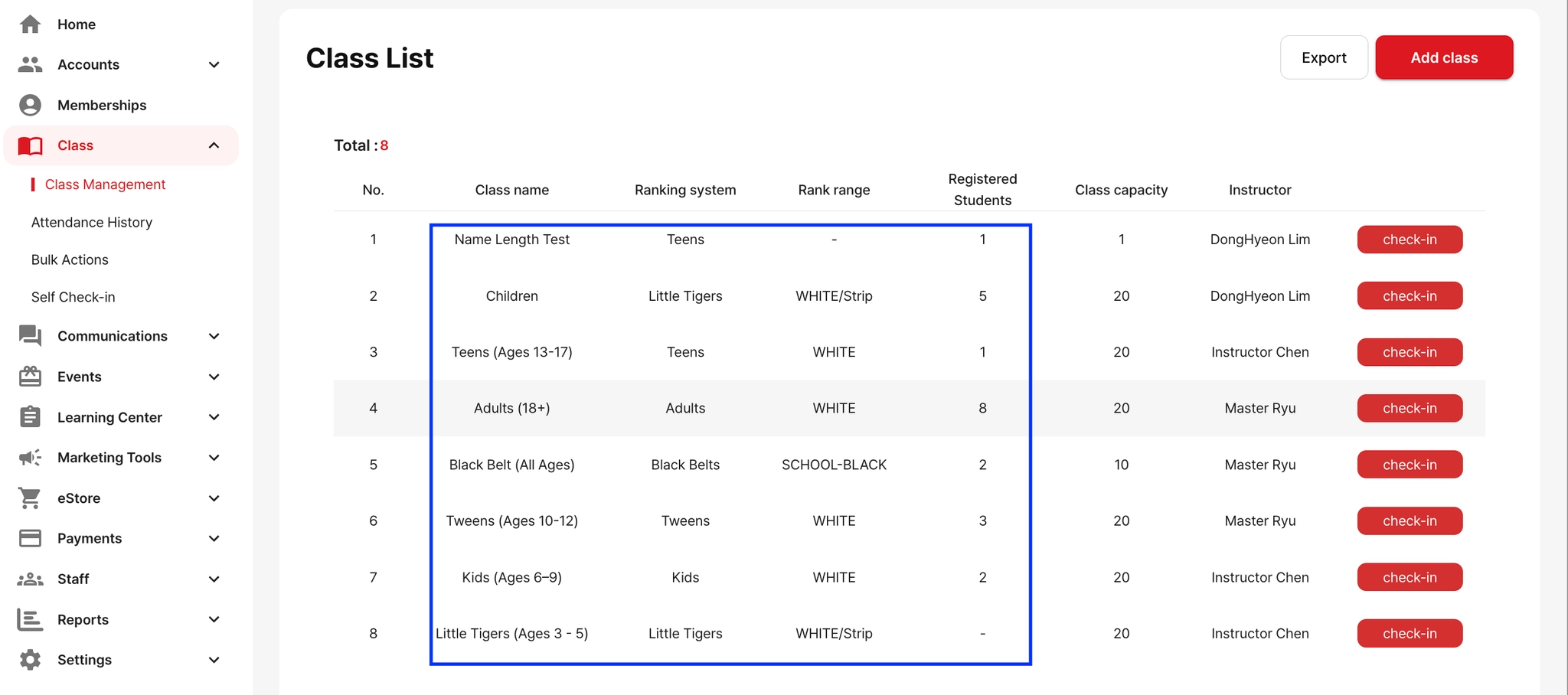 Use this section to view all classes and manage roster details.Review class details, click a name to open, use check-in from the list.Inside a specific class, press Edit to update schedule, rank system, instructor, or capacity.Actions include: Add Members, Remove Members, Assign Schedule.