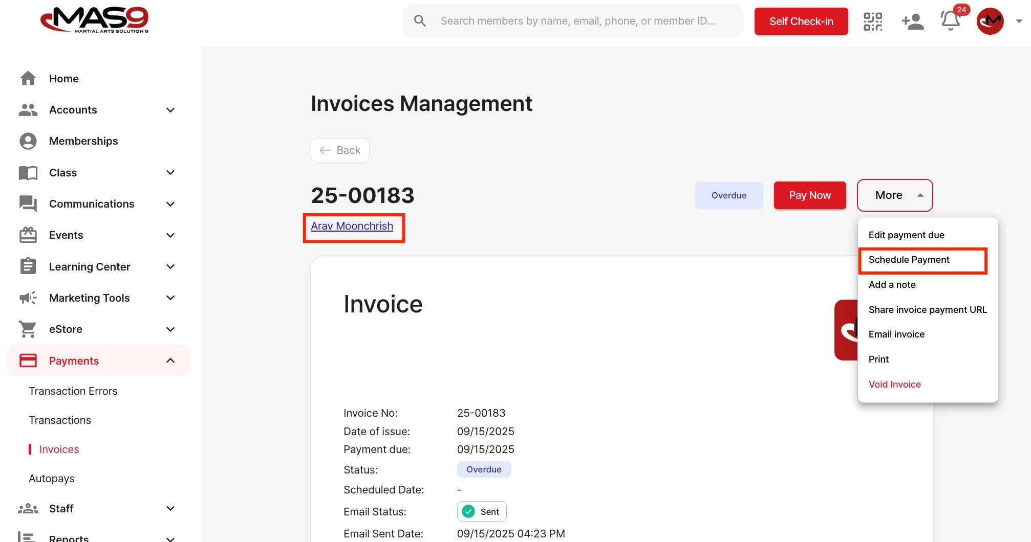 Go to Payments → Invoices.Open the invoice you want.Click More on the top right.Select Schedule Payment from the dropdown menu.