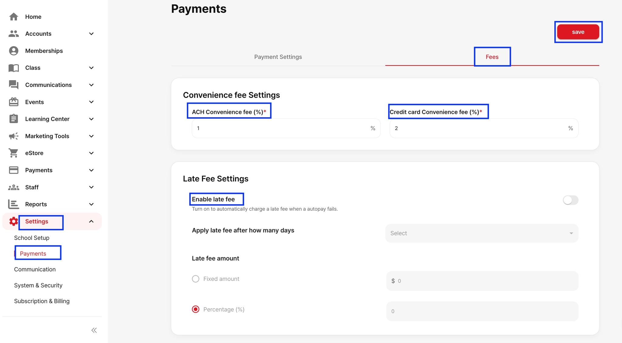 You can configure processing fees for ACH and credit card payments through your school settings.Go to Settings > Payments > FeesHere, you can set the following: ACH Processing Fee, Credit Card Processing Fee, Late feeMake sure to save your changes after updating the fee settings.